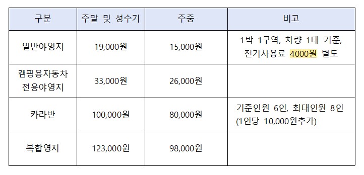 카라반과 데크를 복합으로 쓸 수 있고 기준인원 6명 최대인원 8명까지 가능하고 기준인원 추가 시 1만 원 추가 금액이 발생합니다.