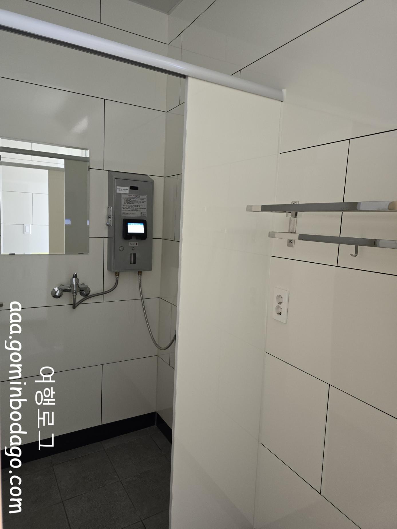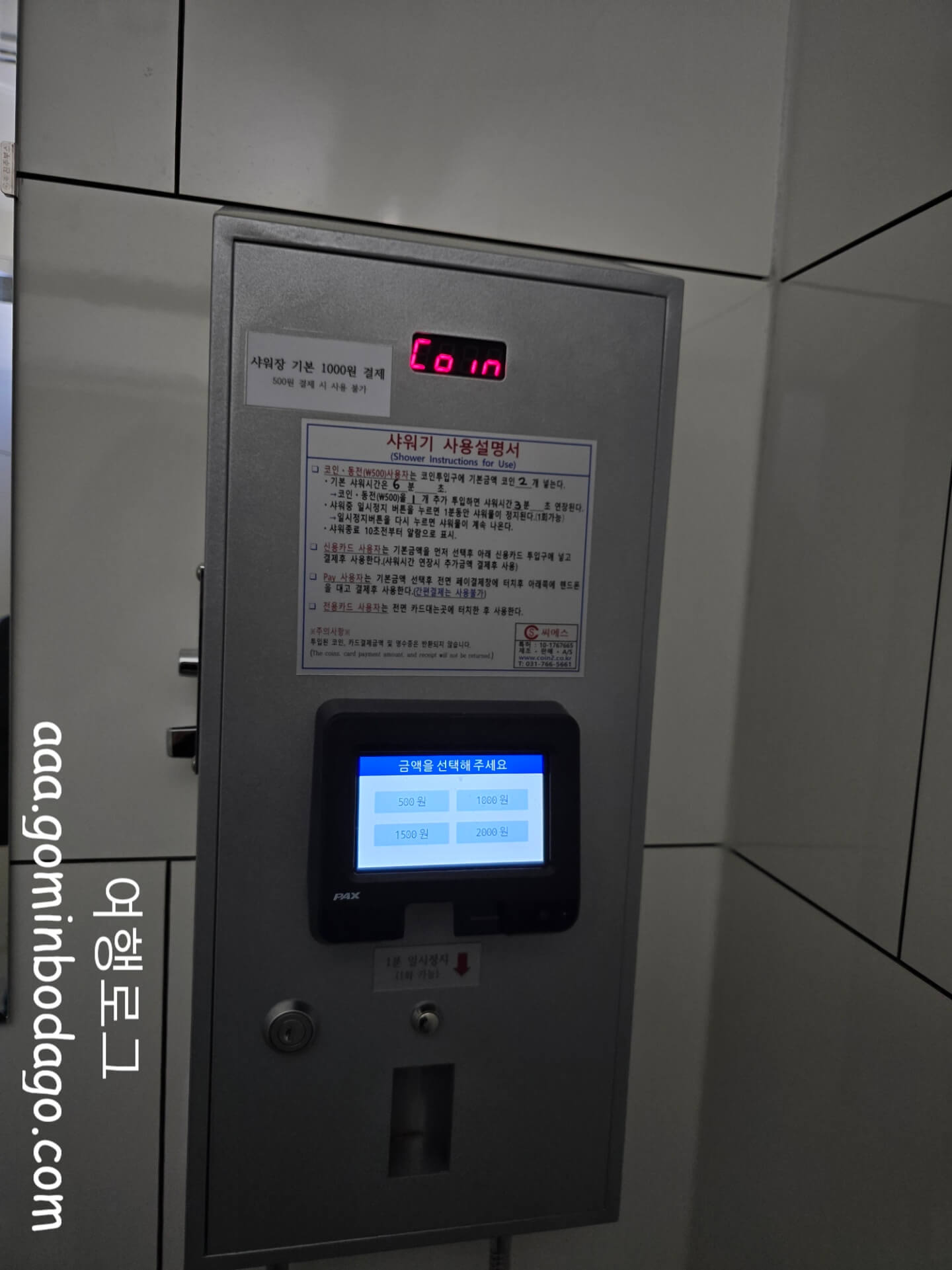 샤위장은 기본 1000원 결제해야 사용가능, 1000원에 기본샤워 시간은 6분, 신용카드 결제도 가능합니다.