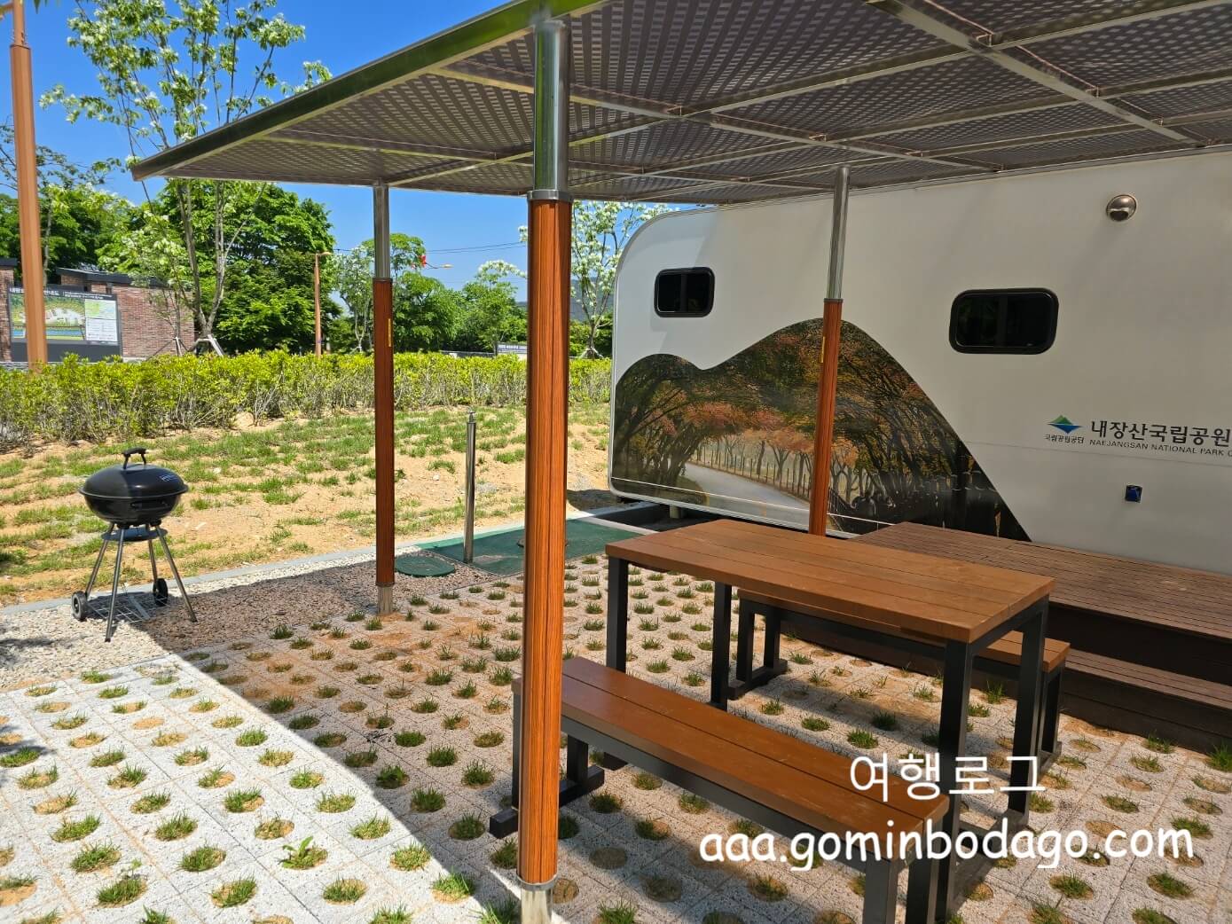 카라반 앞에는 튼튼한 천장이 설치되어 있고 테이블과 의자 그리고 한편에 바베큐 그릴이 있습니다.
