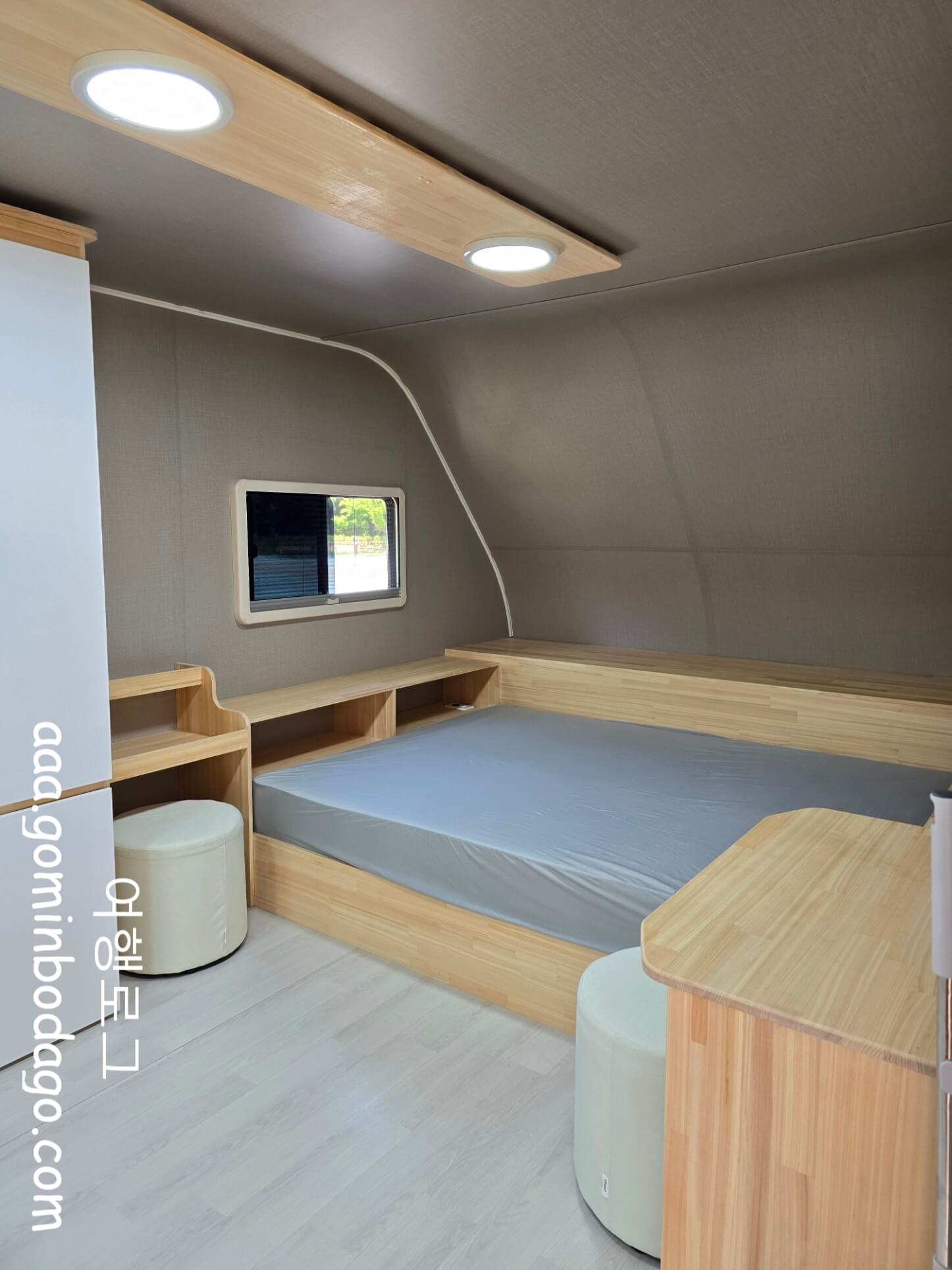 카라반안은 양쪽으로 침대가 들어가 있고 중간에 개수대와 테이블 및 소파가 설치되어 있습니다.