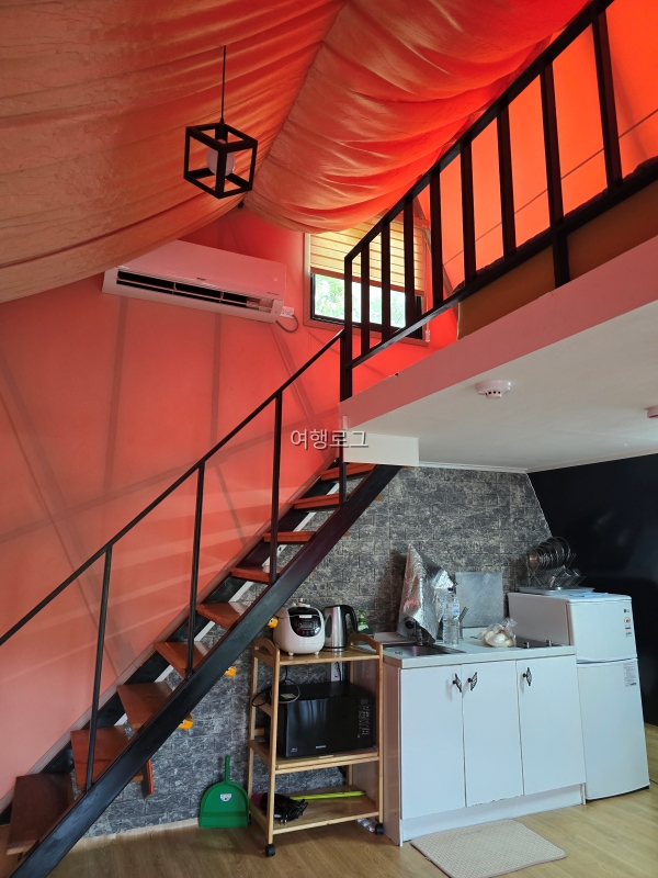 복층 구조인 글램핑 내부는 층고가 높고 위로 올라갈 수 있는 계단이 있습니다. 최대 이용 인원은 4명까지 가능하고 가족 단위나 친구들끼리 오기에 적당한 크기입니다.