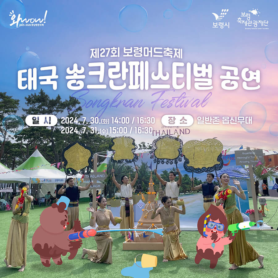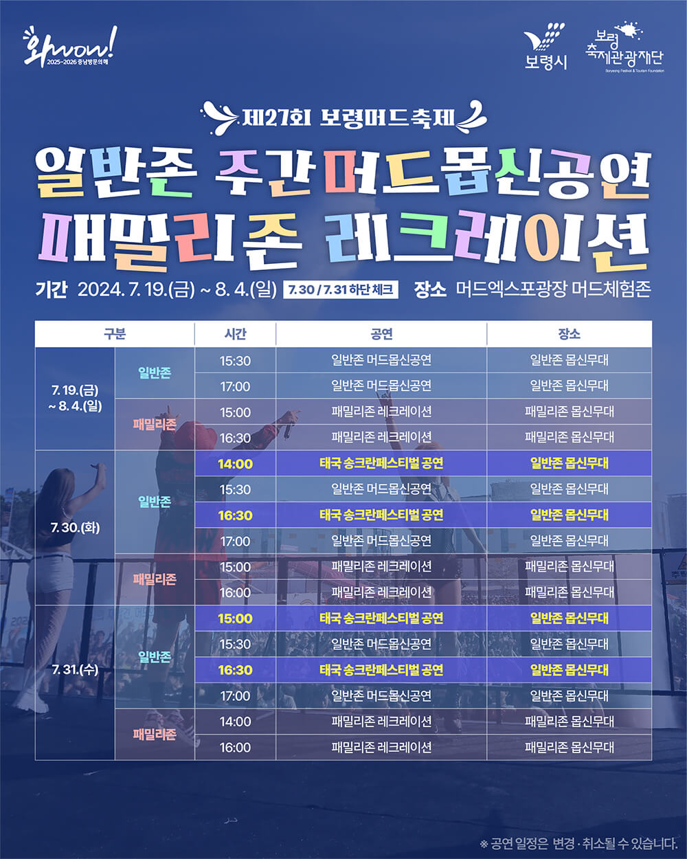 태국관광청(송크란축제)와 관광교류협약 체결하여 열리는 송크란페스티벌 공연이 7. 30.(화) 14:00,16:30 / 7. 31.(수) 15:00 ,16:30 으로 예정되어 있습니다. 일반존에서는 시원한 머드 물대포와 EDM공연이 함께하는 머드몹신공연을 볼 수 있으며 패밀리존에서는 여러 레크레이션이 진행됩니다.