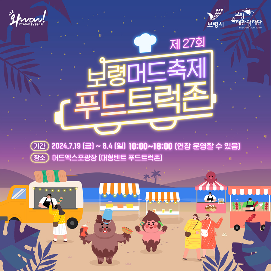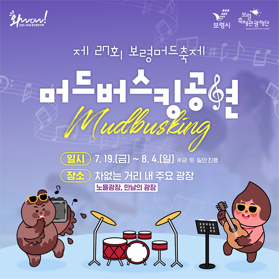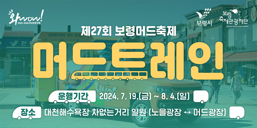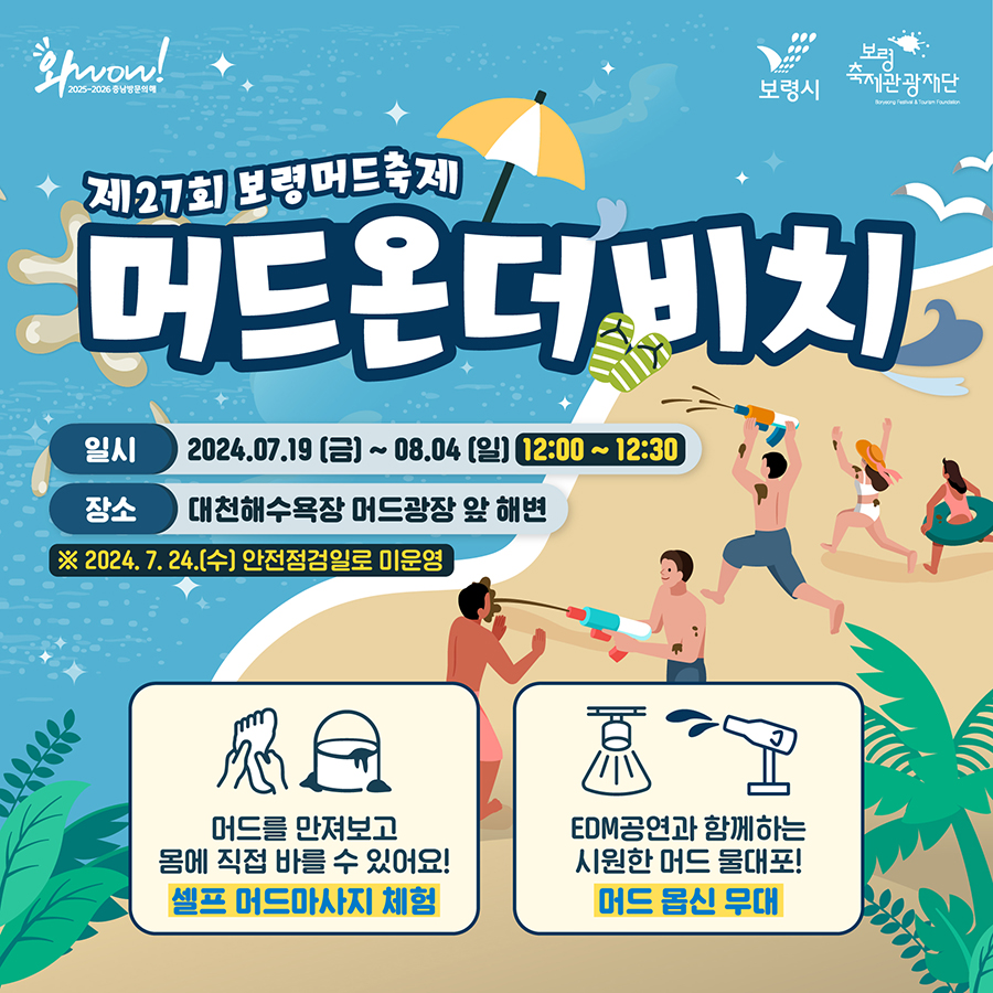 대한민국을 대표하는 여름 축제인 제27회 보령머드축제가 7월 19일~8월4일 17일간 충남 보령시 대천해수욕장 일원에서 열립니다. 특히 올해는 축제 속 축제로 드론불꽃쇼, EDM공연, 보령머드가요제, 포세이돈 워터뮤직 페스티벌, 머드락 등 다양한 공연 프로그램과 대회형 프로그램인 강철머드 챌린지, 체험 프로그램인 머드몹신, 머디엠, 머드뷰티케어 등과 공군블랙 이글스의 에어쇼, 머드스트릿퍼포먼스 등 37개의 프로그램이 다양하게 진행됩니다.