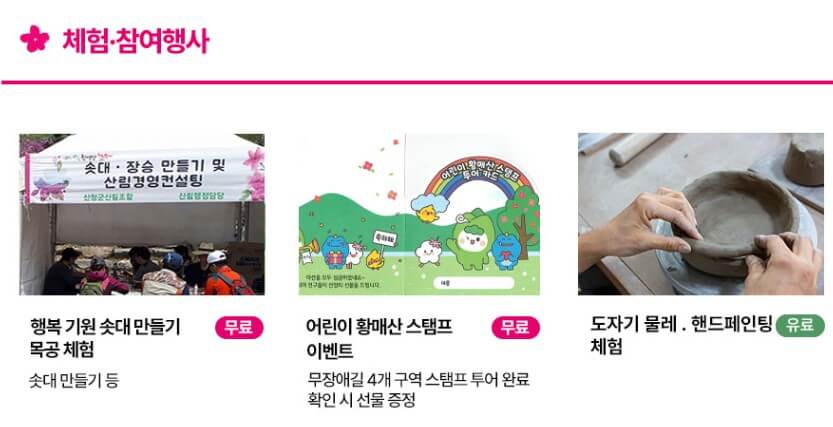어린이들을 위한 어린이 황매산 트레킹 스탬프 투어에서는 무장애길 4개 구역을 통과한 후 스탬프를 모으면 선물을 증정하고 탐방객 누구나 참여할 수 있는 행복 기원 솟대 만들기, 도자기 물레 및 핸드페인팅 체험 등 다양한 참여 행사도 진행됩니다.