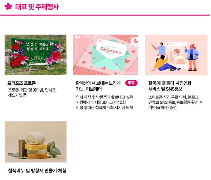 이번 축제는 지역 문화자원을 활용한 특성화된 체험 프로그램을 운영합니다. 먼저 철쭉의 꽃말이 ‘사랑의 즐거움’이라는 점에 착안한 프러포즈 포토존을 운영합니다. 또 느리게 가는 러브레터를 통해 그동안 말로 할 수 없었던 못다 한 말을 전할 수 있는 엽서를 보낼 수 있습니다. 스마트폰 사진 무료 인화 및 SNS 홍보 행사와 철쭉비누 및 방향제 만들기 체험으로 철쭉의 진한 향기를 담아갈 수 있습니다.