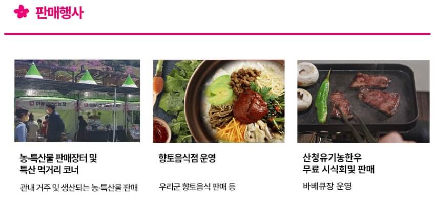 황매산이 있는 차황면의 청정 농산물뿐 아니라 산청 전역의 농특산물을 만날 수 있고, 특산 먹거리와 향토음식점에서는 지역에서 자란 우수 농특산물을 활용한 다양한 먹을거리를 맛볼 수 있습니다. 또 올해 새롭게 마련된 산청 유기한우 무료시식 및 할인판매 행사도 진행합니다.