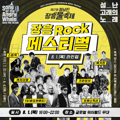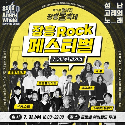 장흥물축제에서 올해 처음 선보이는 락 페스티벌 ‘성난 고래의 노래’는 음악과 함께 환경 보호의 중요성을 알리는 특별한 행사입니다. 바다 오염의 주범인 해양 쓰레기 문제에 대한 전 국민적 관심과 참여를 이끌어 내고 ‘지구의 수호자’ 고래 보호를 위해 모두가 나서야 한다는 메시지를 담고 있습니다.